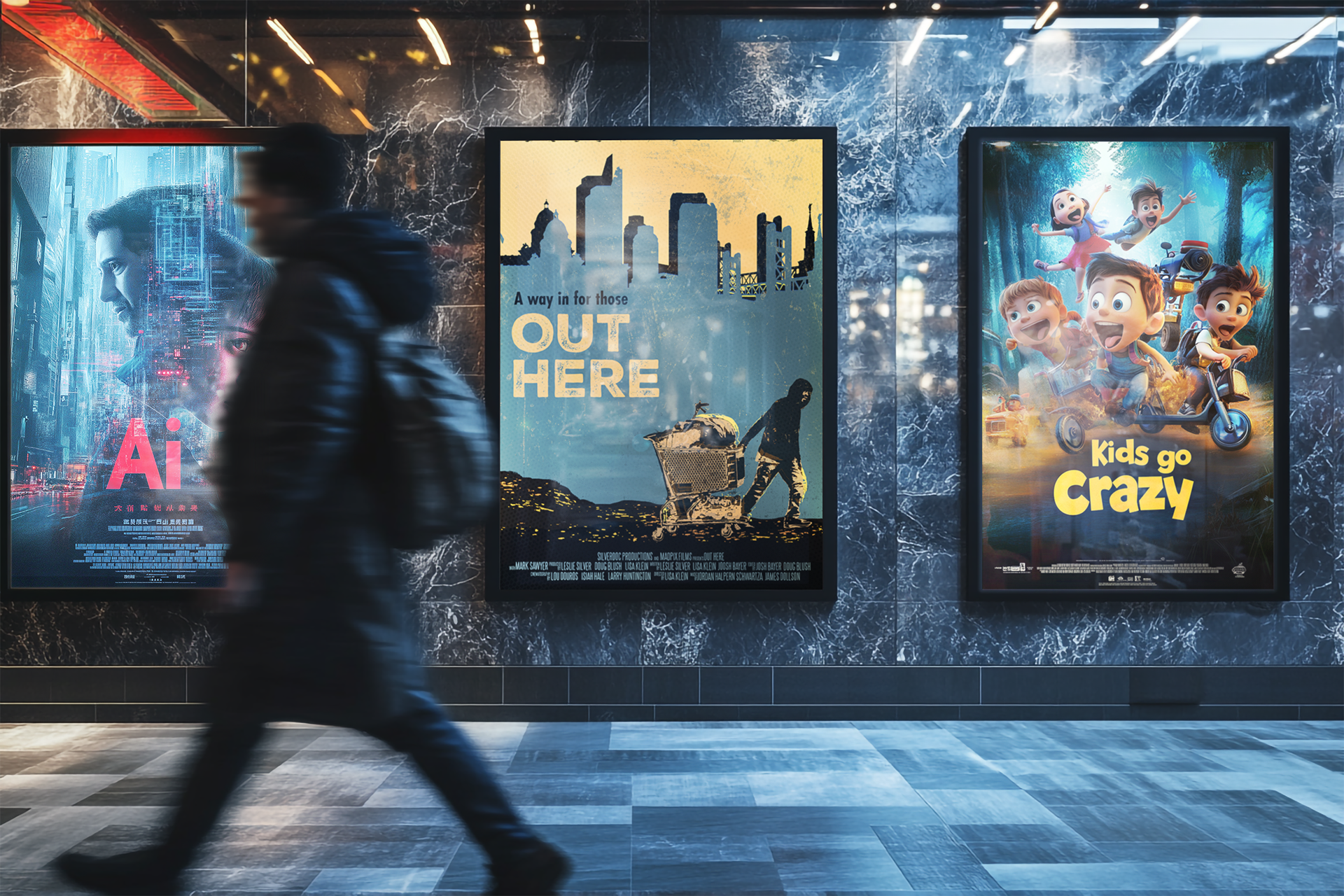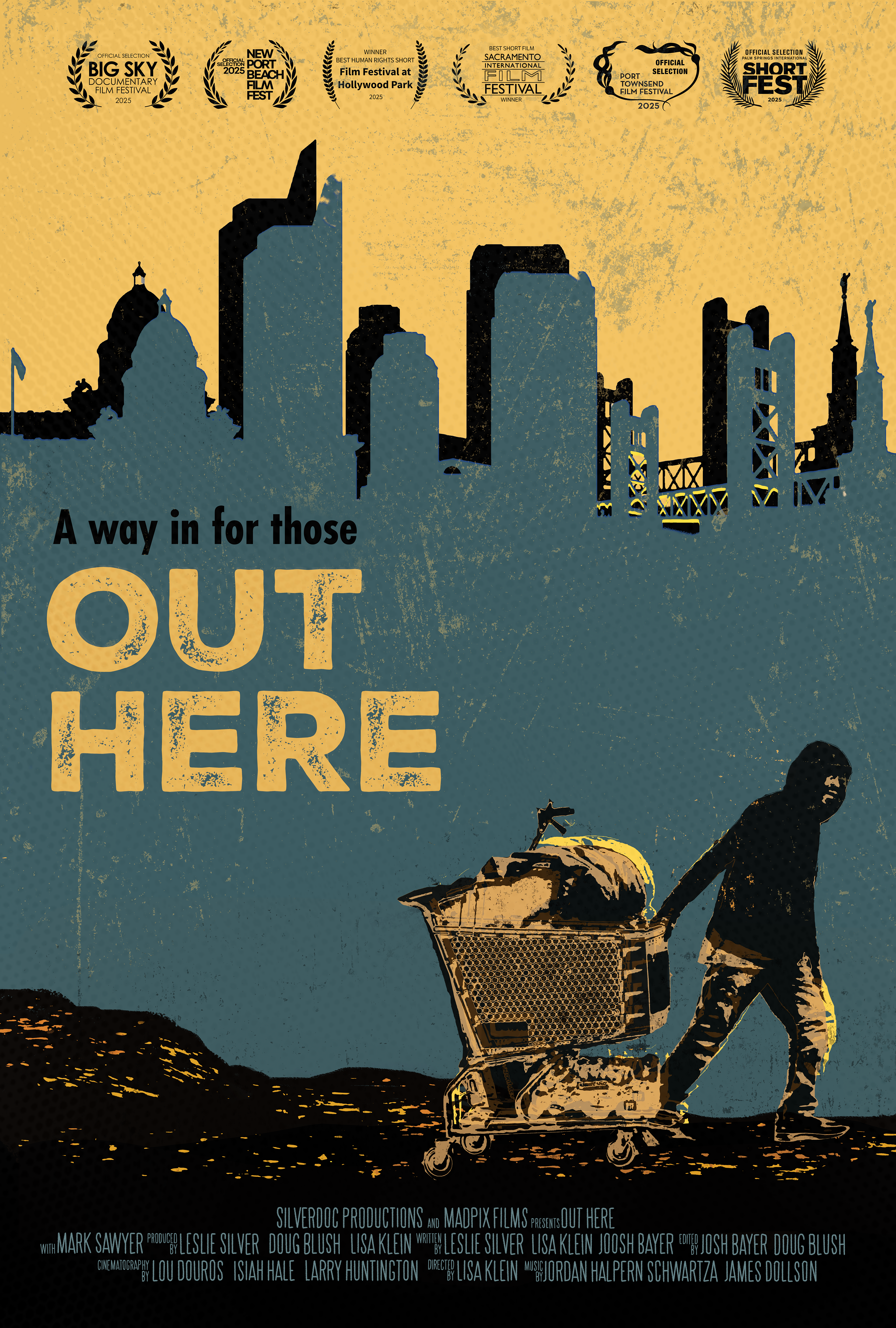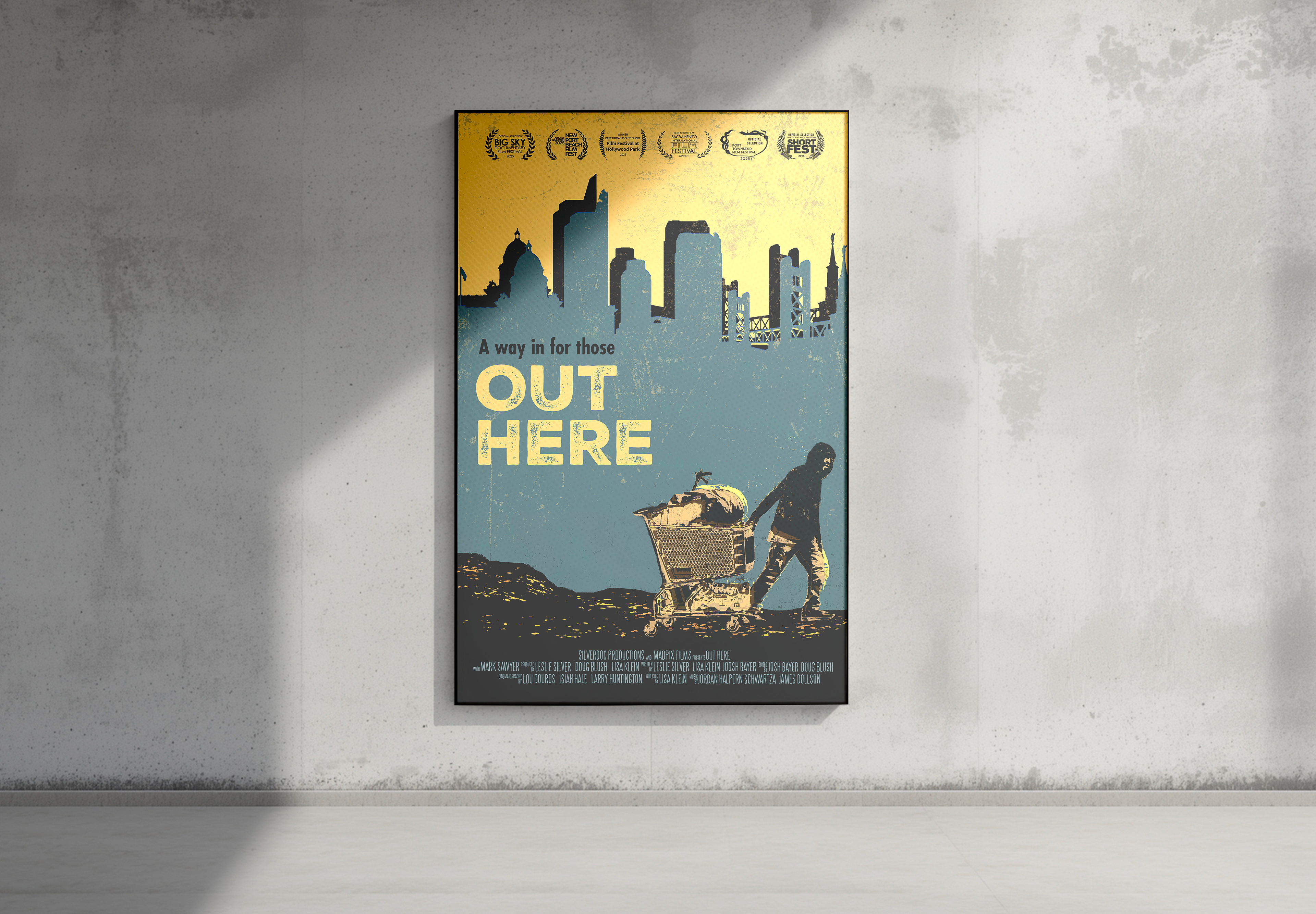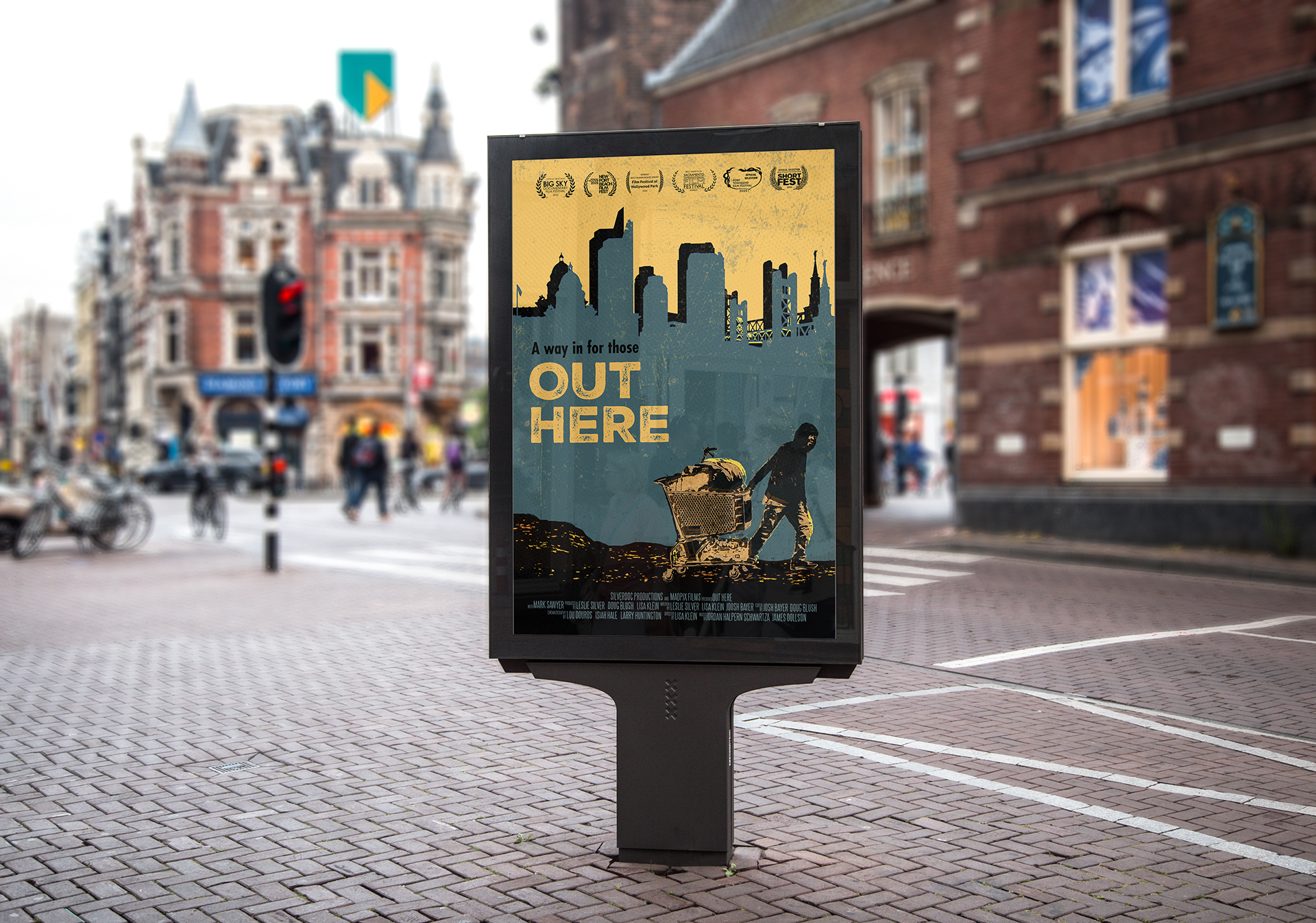 Design a 27 x 40 inch poster for the Film Out Here, complete with a billing block and laurels. VIS 317 assignment.
